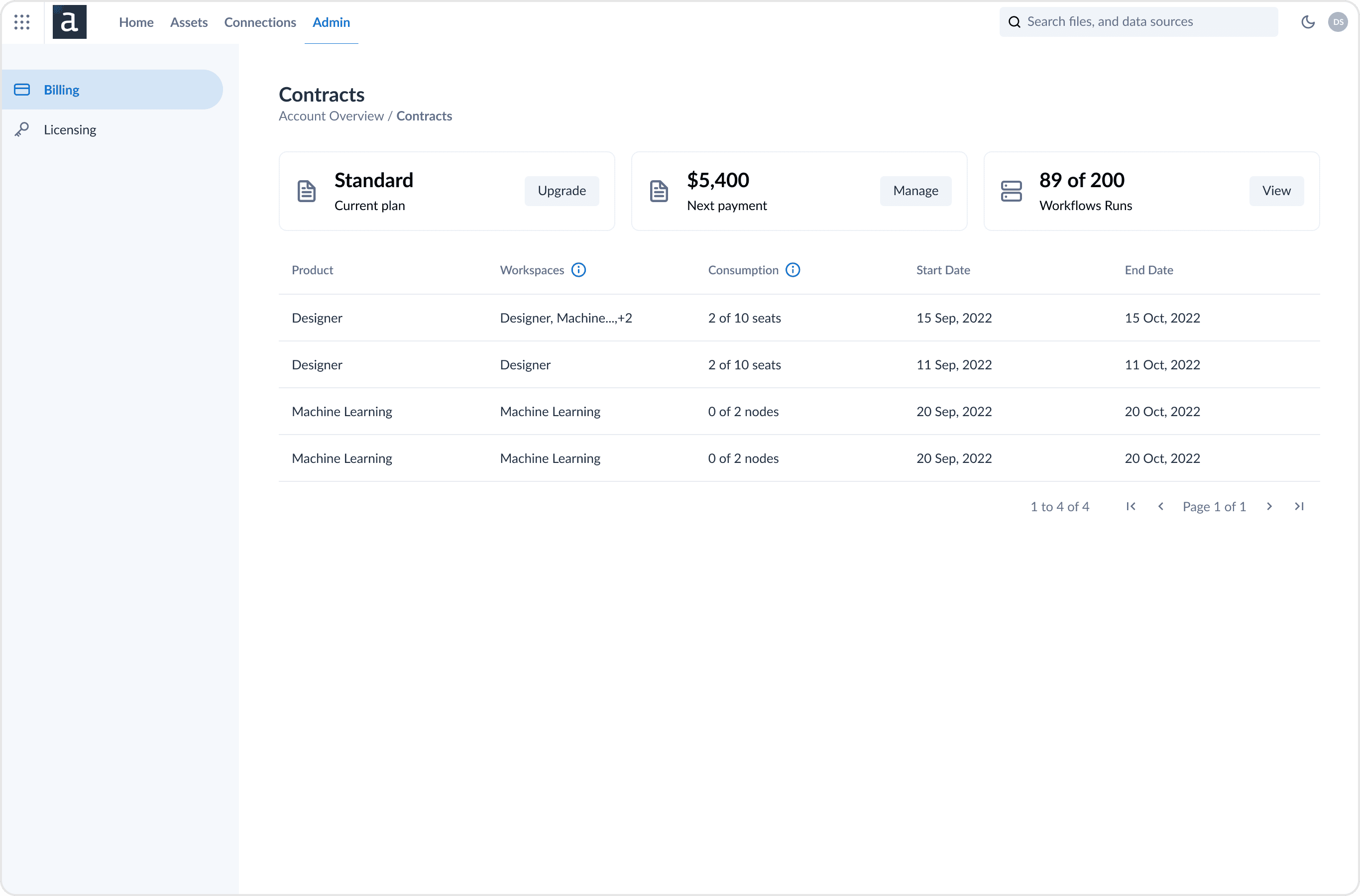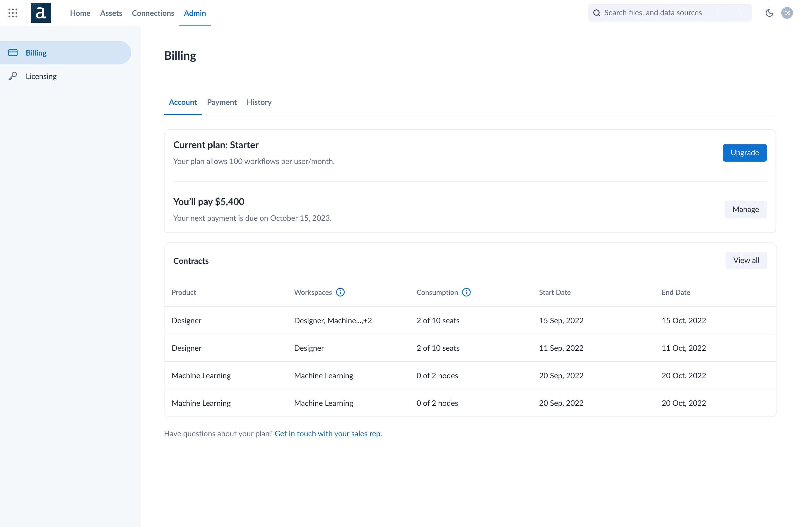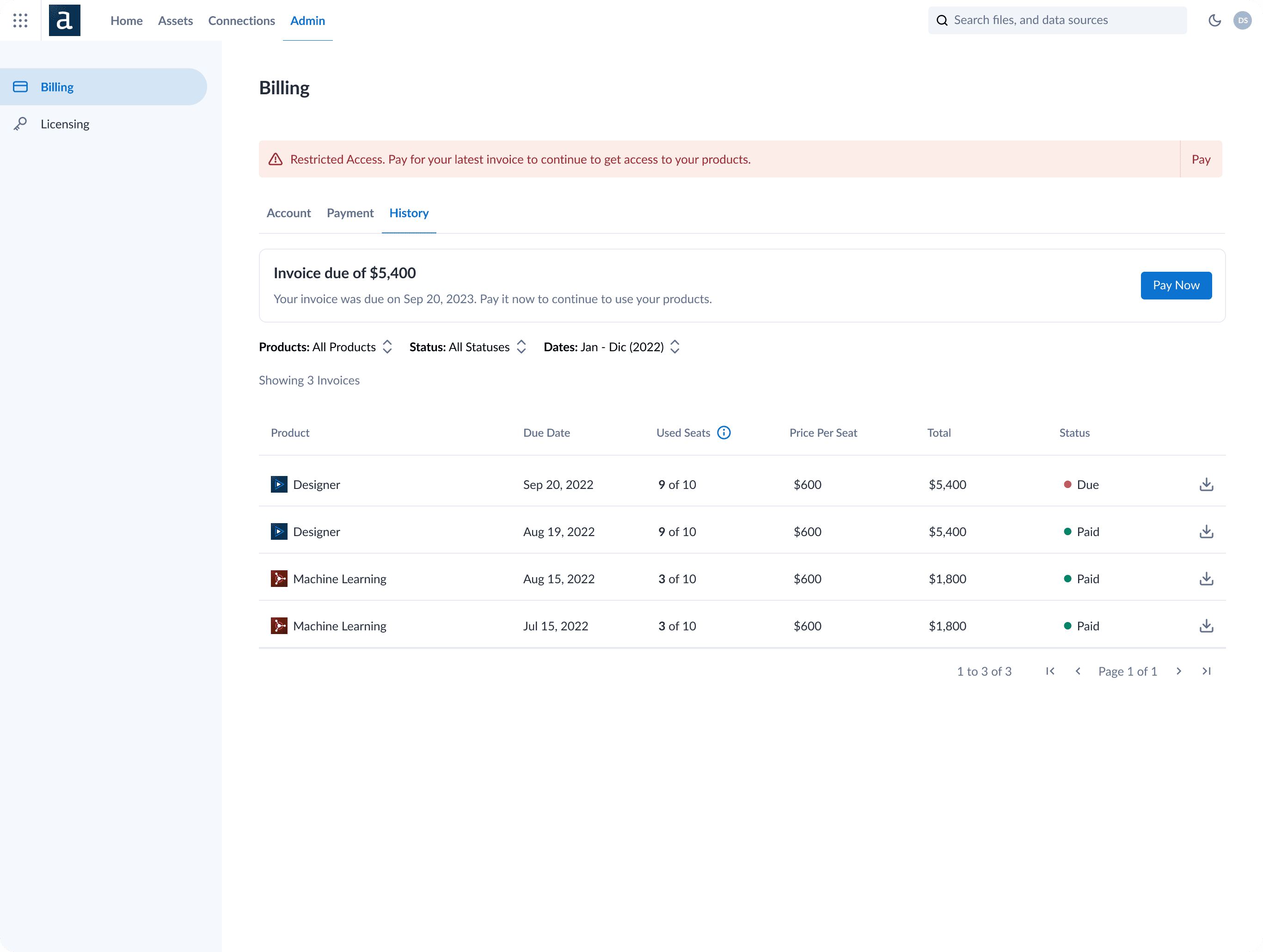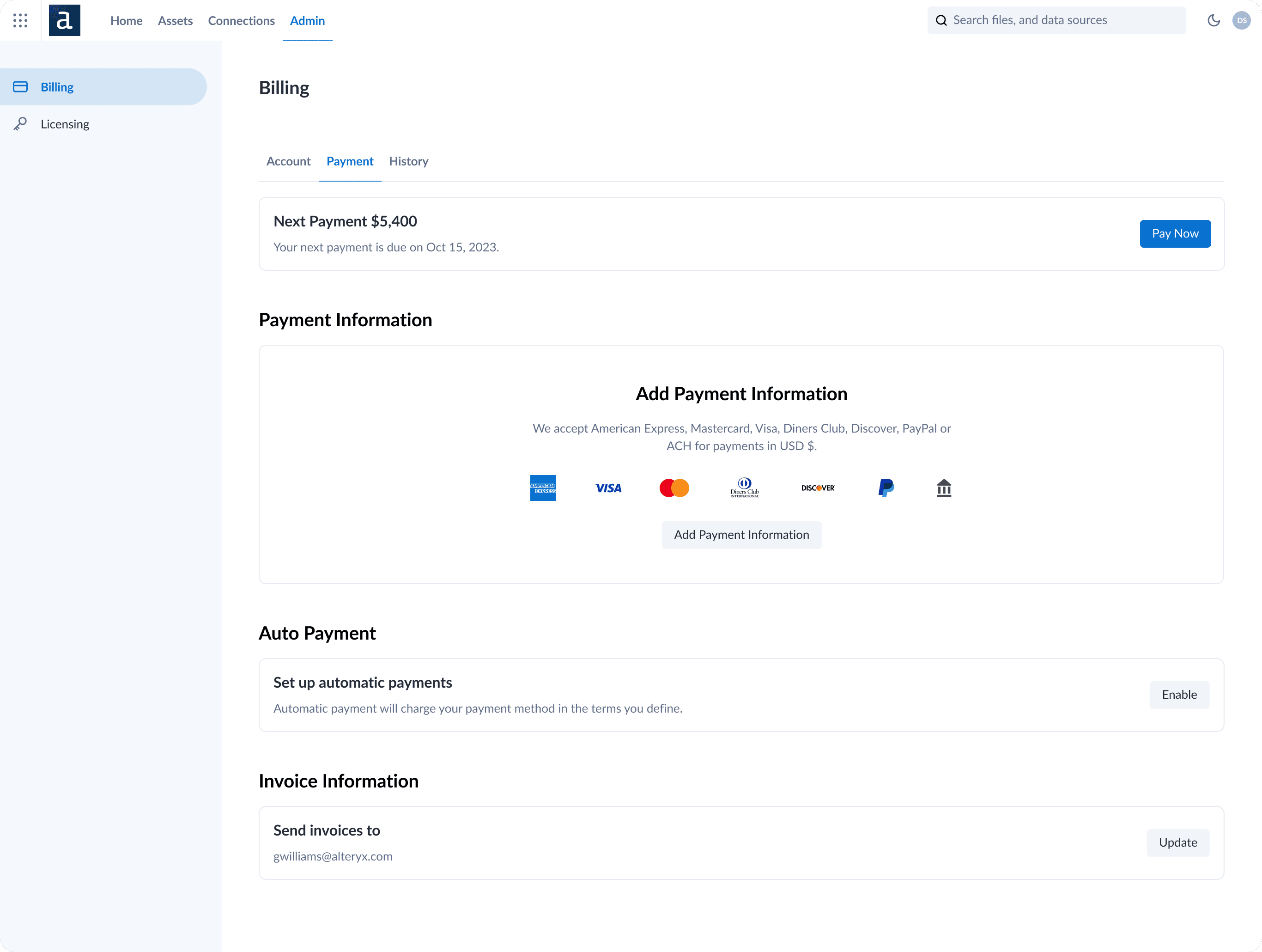 Alteryx needed a unified billing experience for enterprise customers managing multiple cloud applications and workspaces. The existing fragmented system created support burden and confusion around payment processing, subscription management, and invoice access across their product suite.