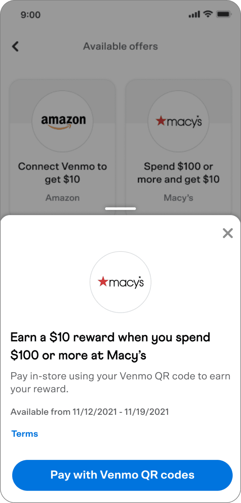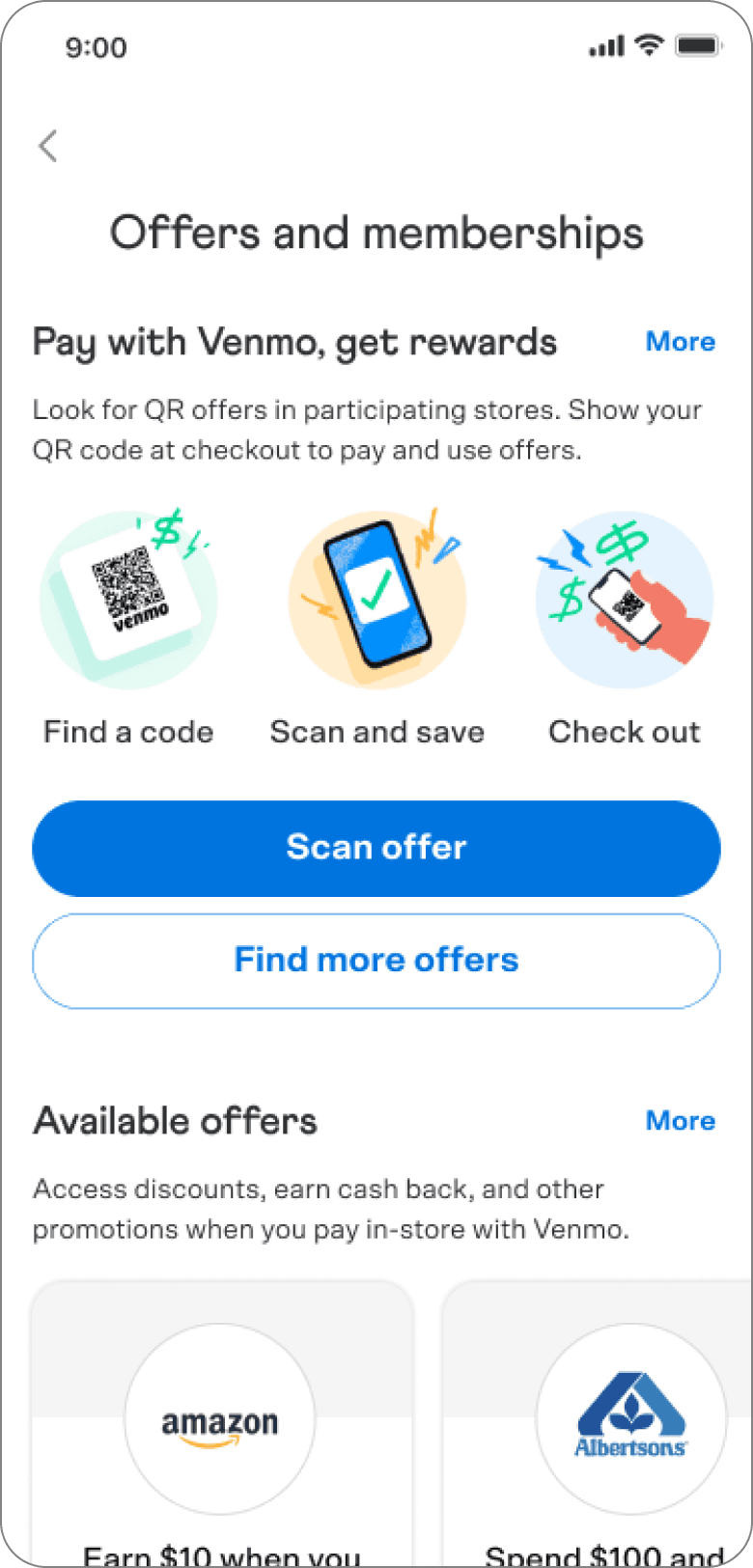 Venmo partnered with merchants to drive repeated Venmo Debit Card usage through a cash-back rewards program. The pilot needed to support multiple campaign types (cross-merchant, single merchant, SMB) while making complex offers easy to understand and track for 70M+ users.