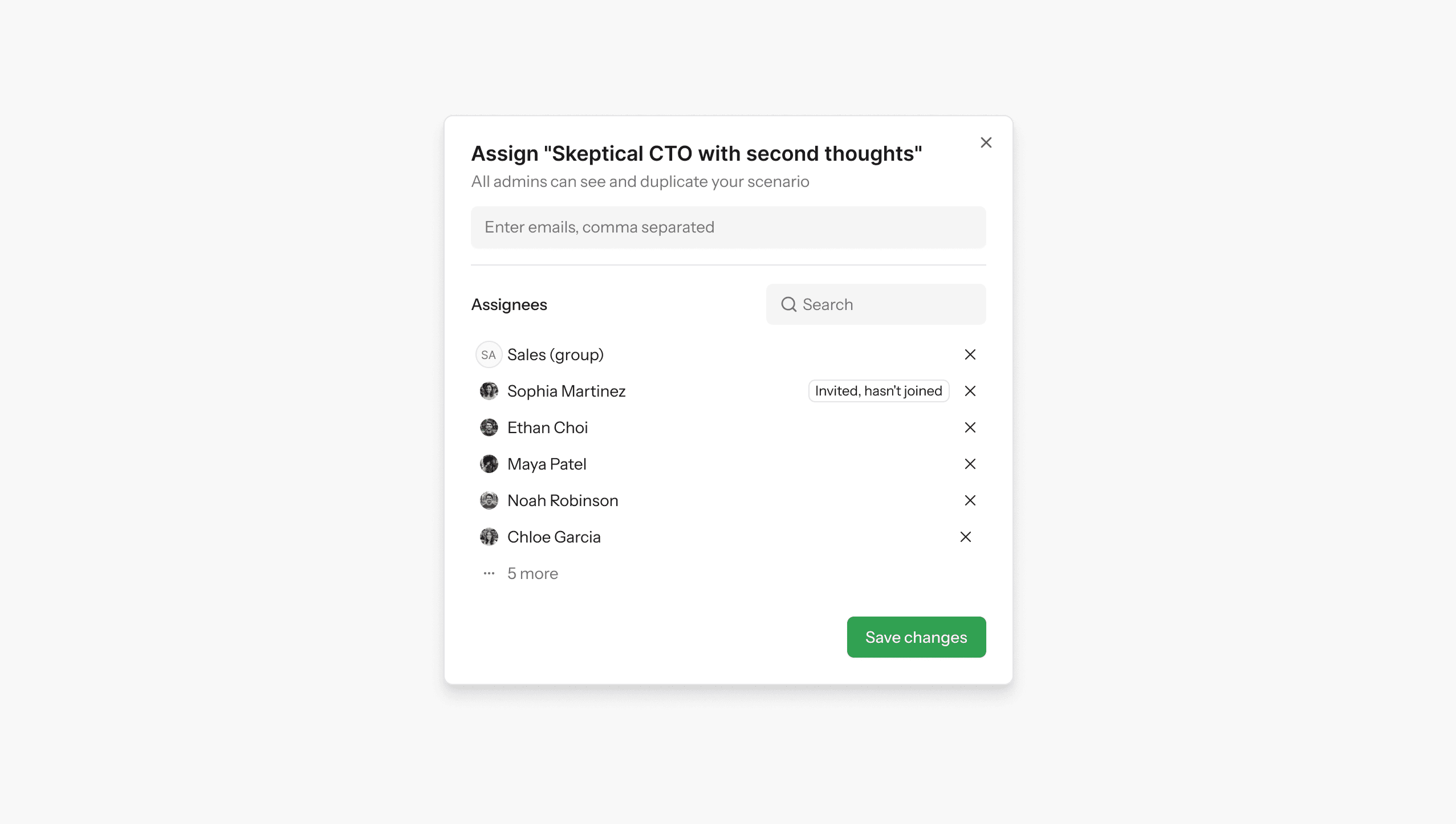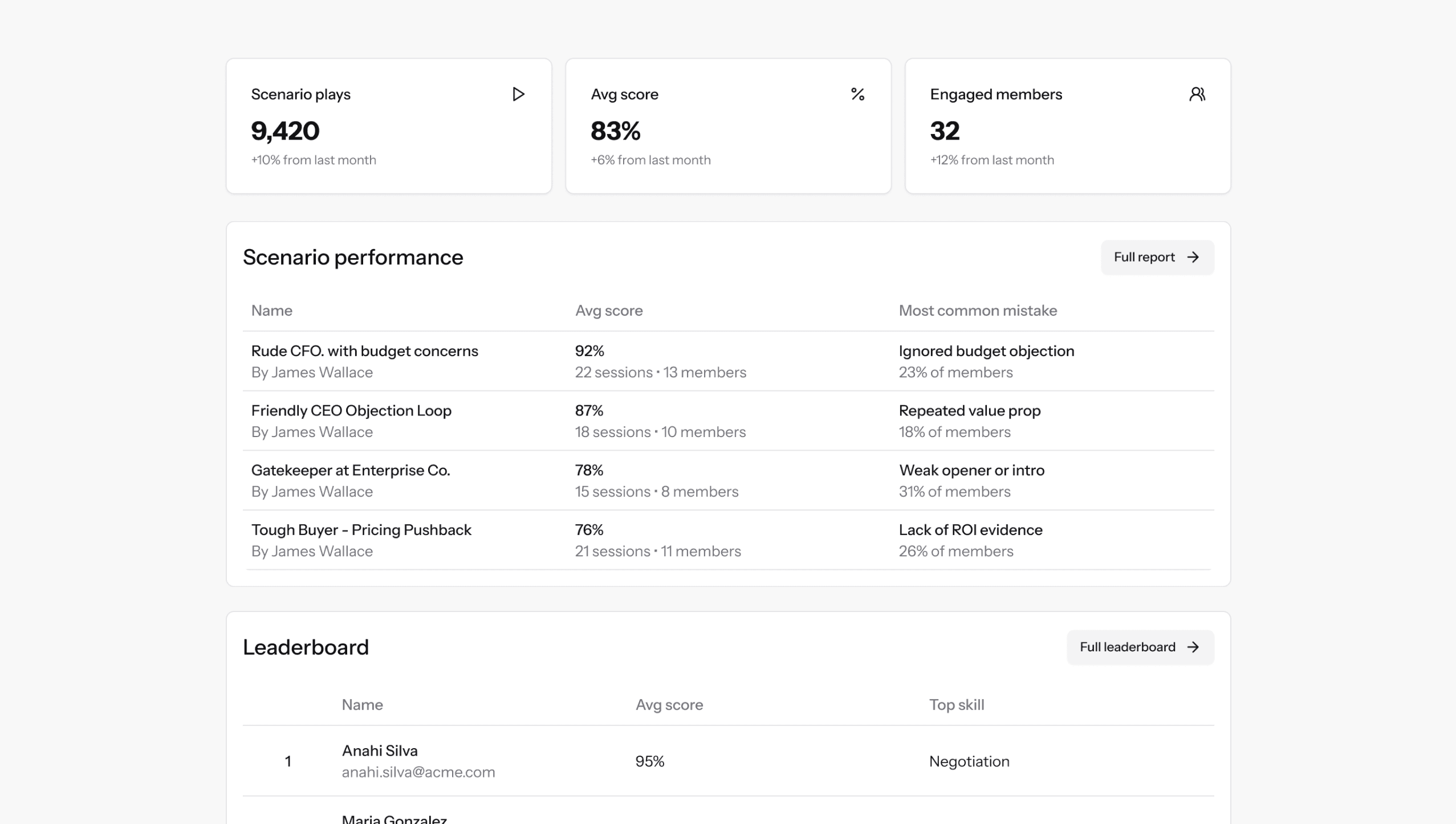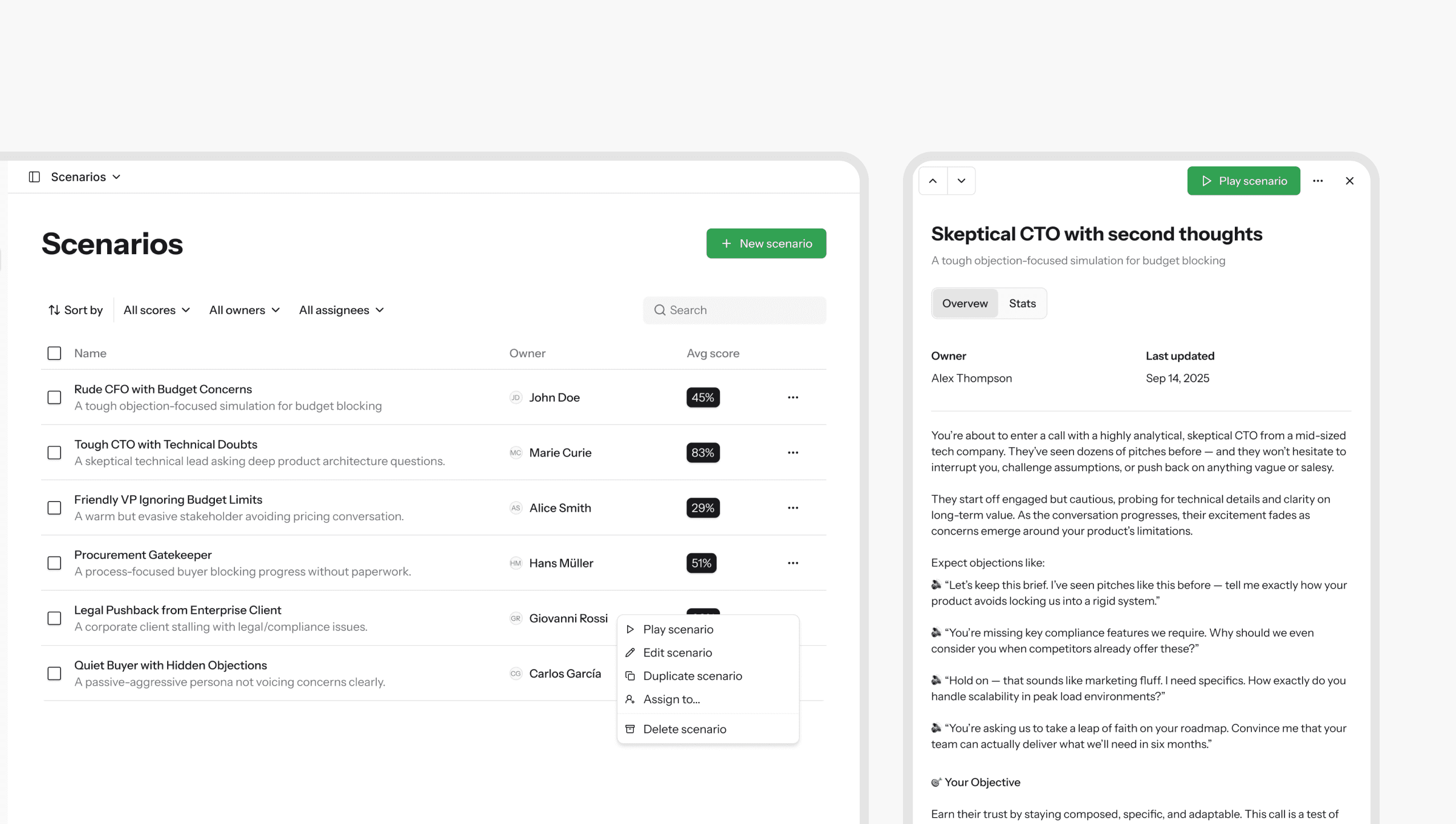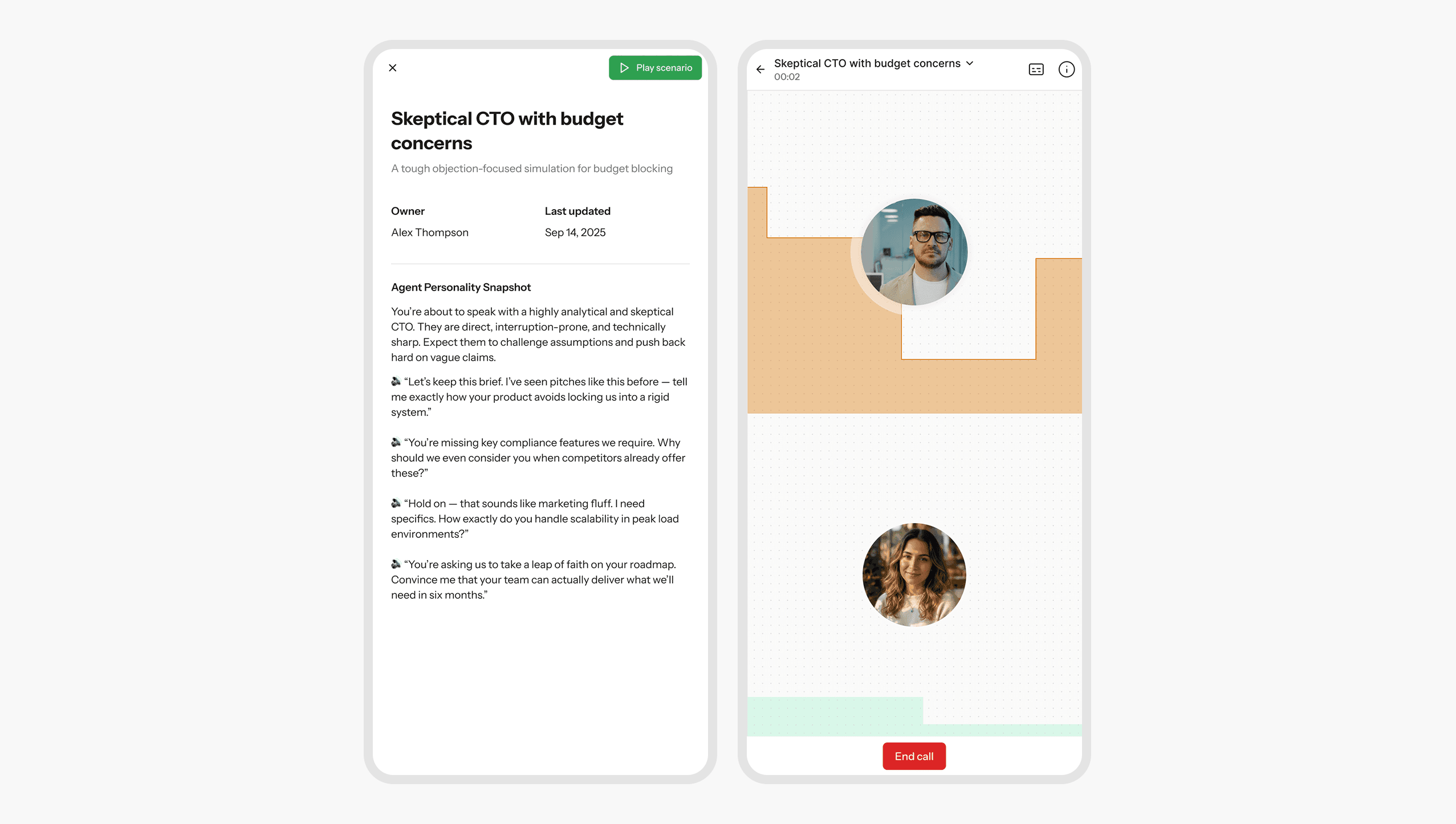 AI-simulated buyer scenarios for reps to practice objections handling, and improve closing skills.