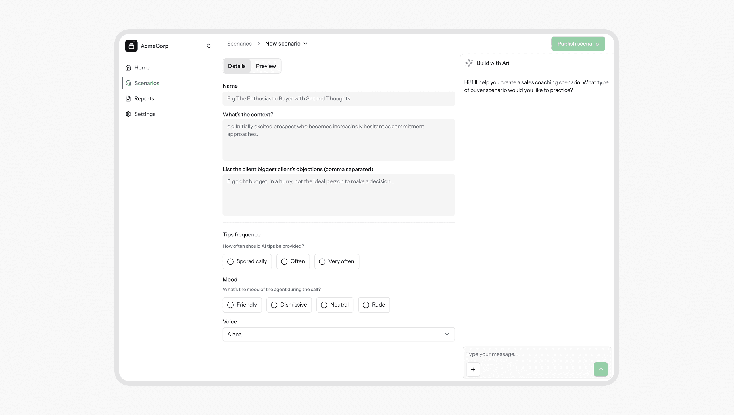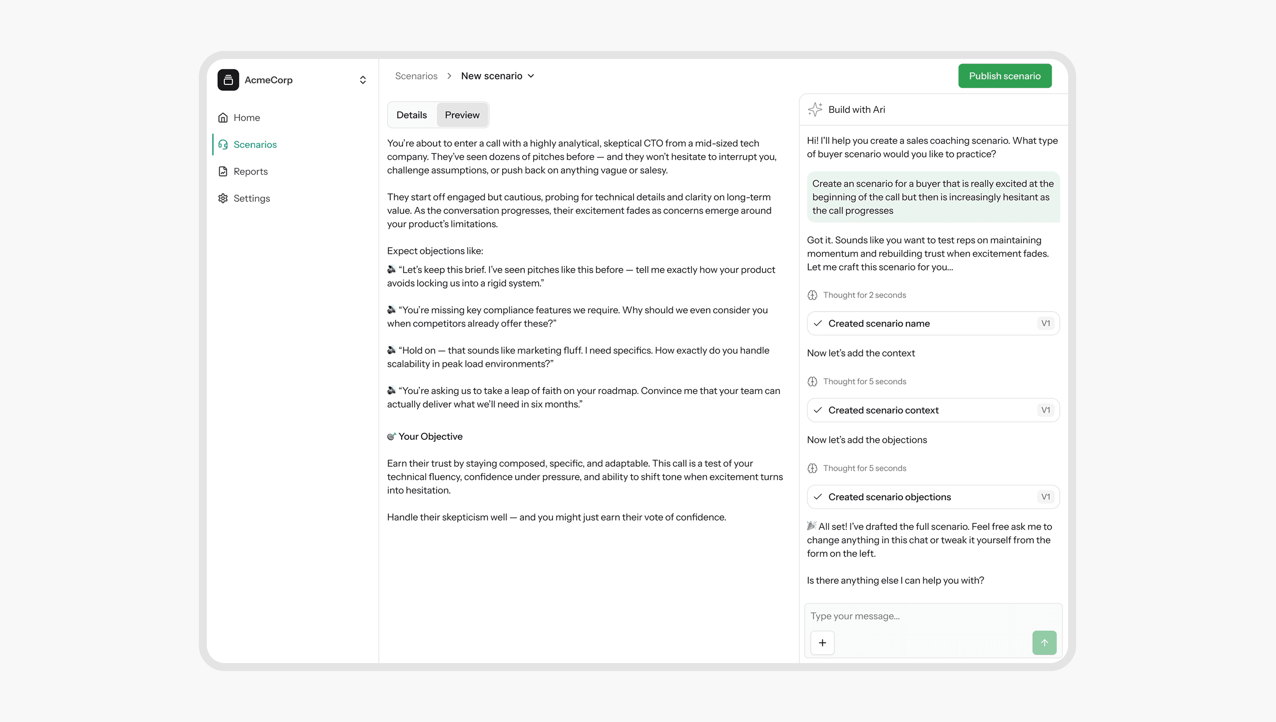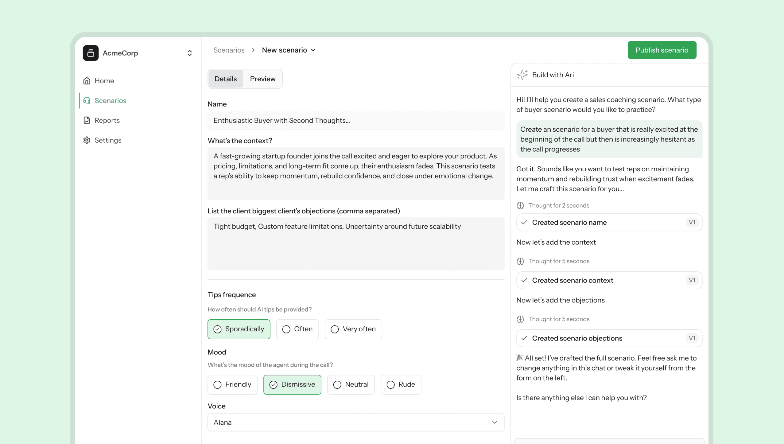 A big design risk: if scenario creation feels like filling out a form, adoption will be low. Arena solves this by keeping the AI assistant on the right side, in context, so managers can describe what they need in plain language, then refine it with lightweight controls (tips frequency, mood, voice).