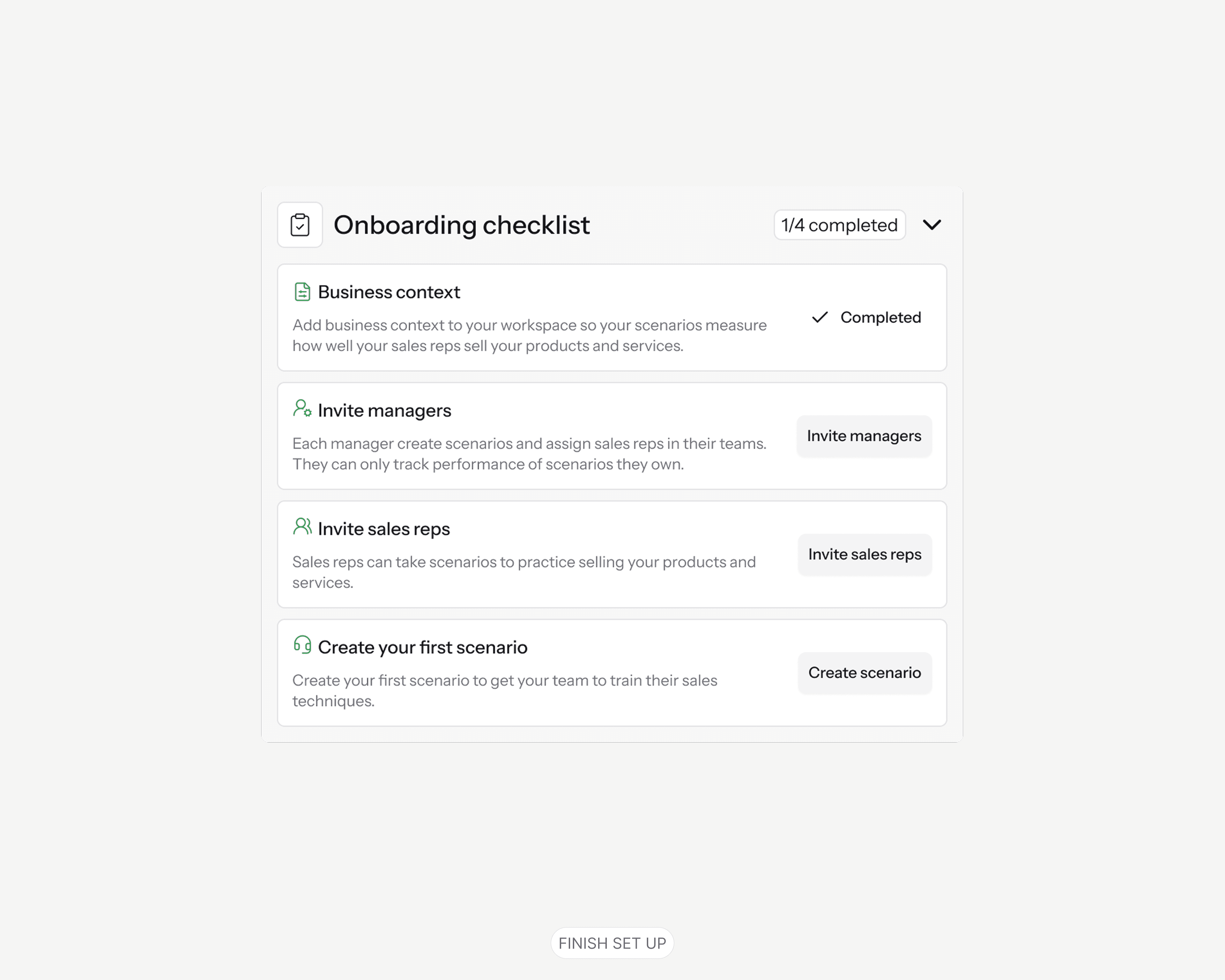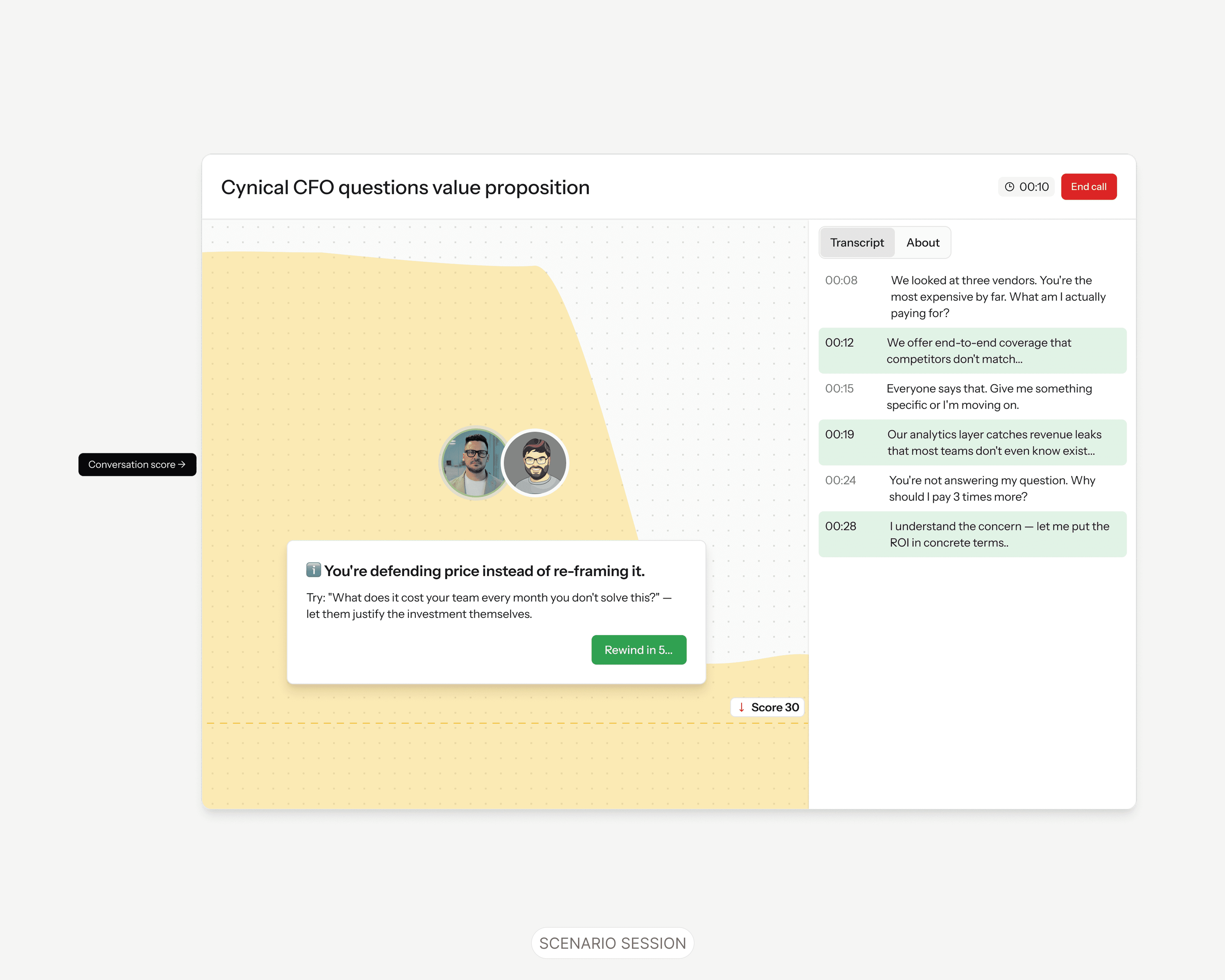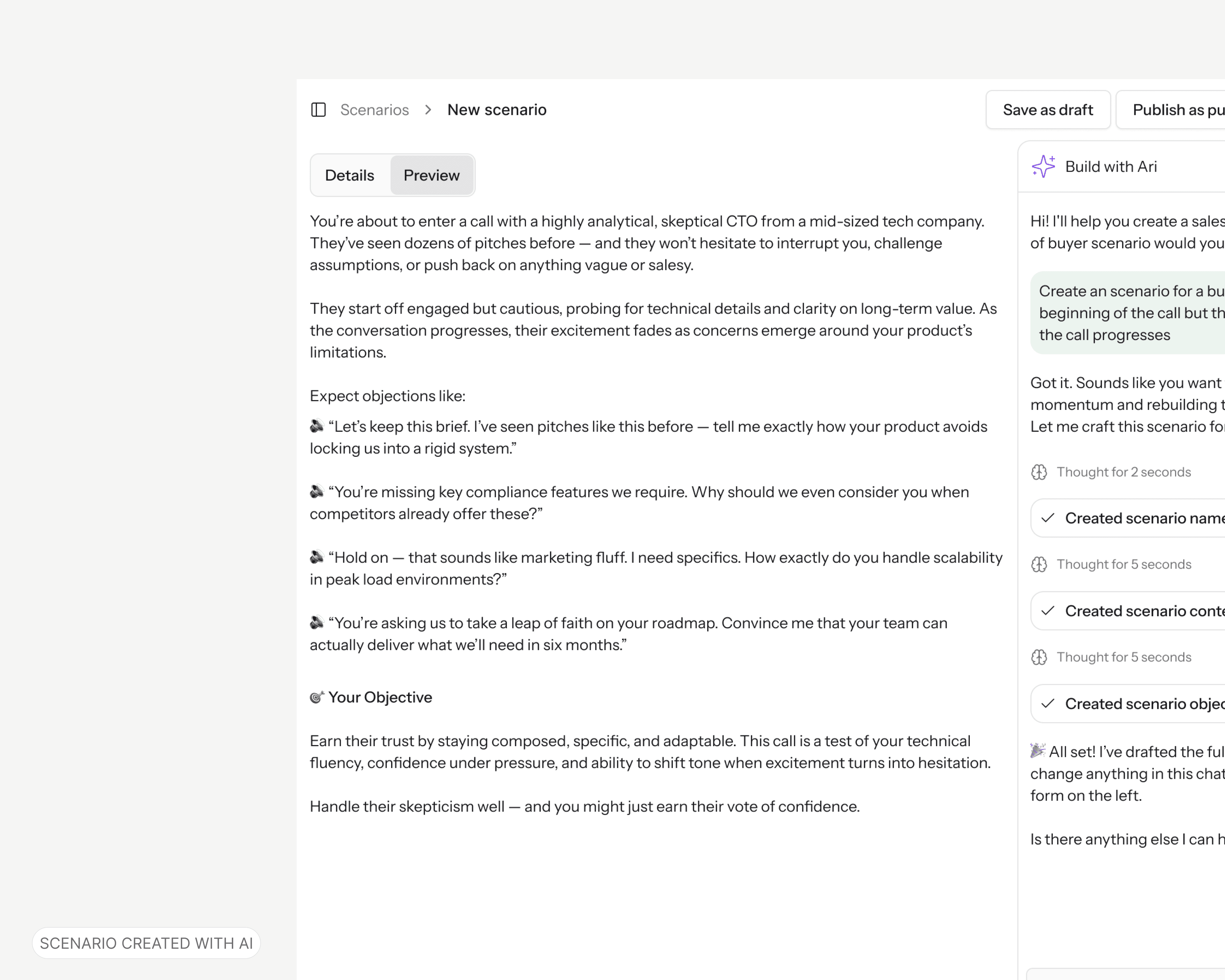 End-to-end scenario creation built from scratch → managers configure AI personas, objections, and difficulty in seconds.
