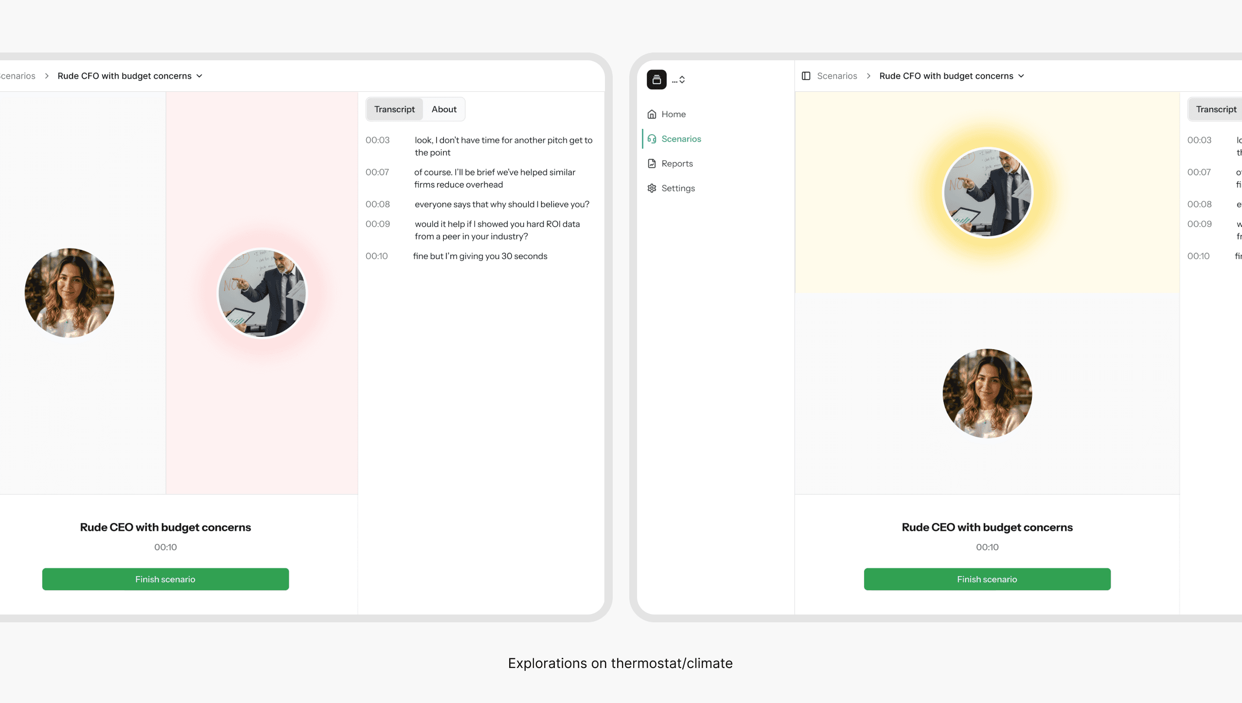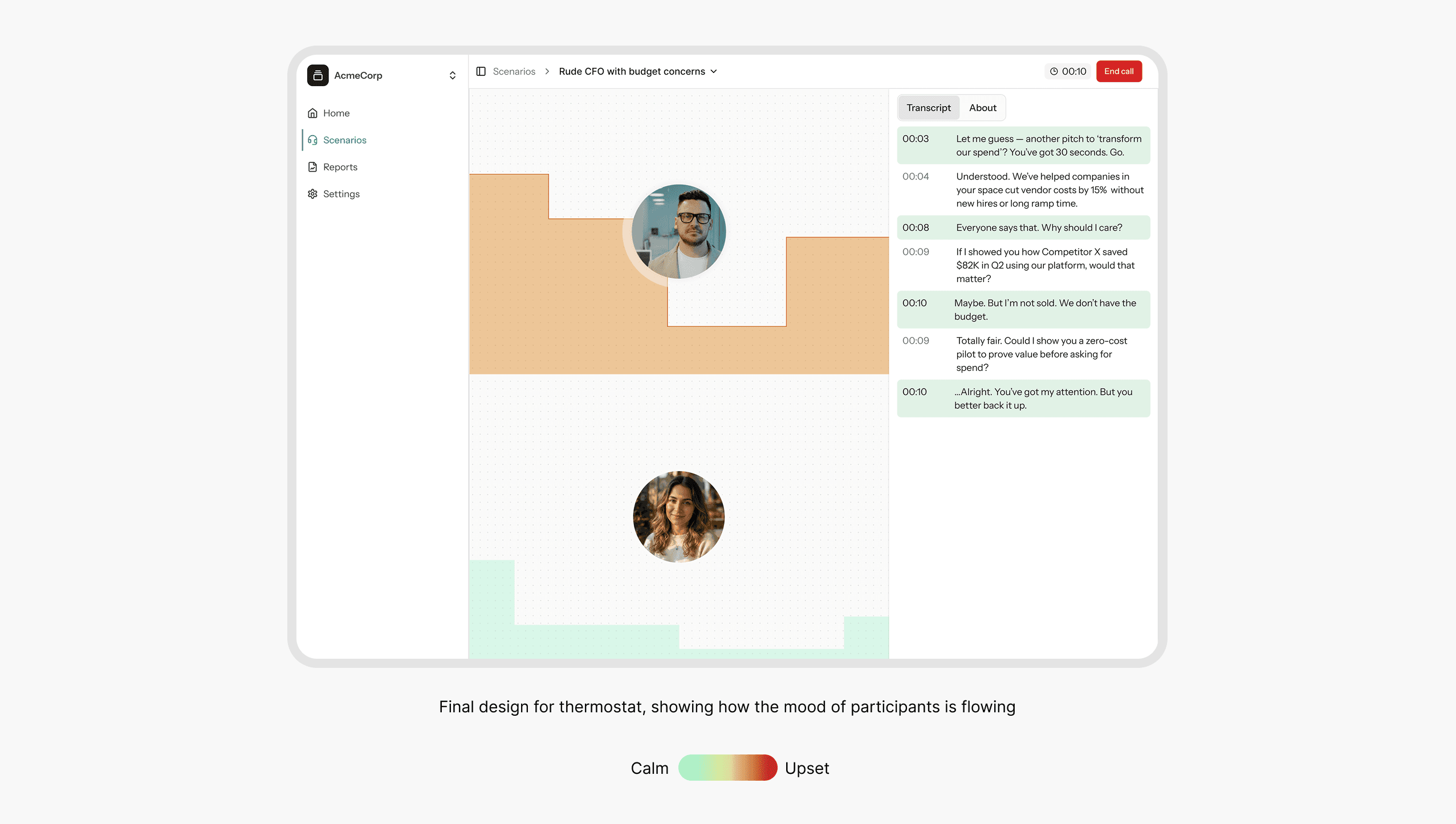 I introduced the thermostat concept: a persistent visual that signals how the conversation is trending, paired with a transcript view so reps can track what happened and adapt in real time.