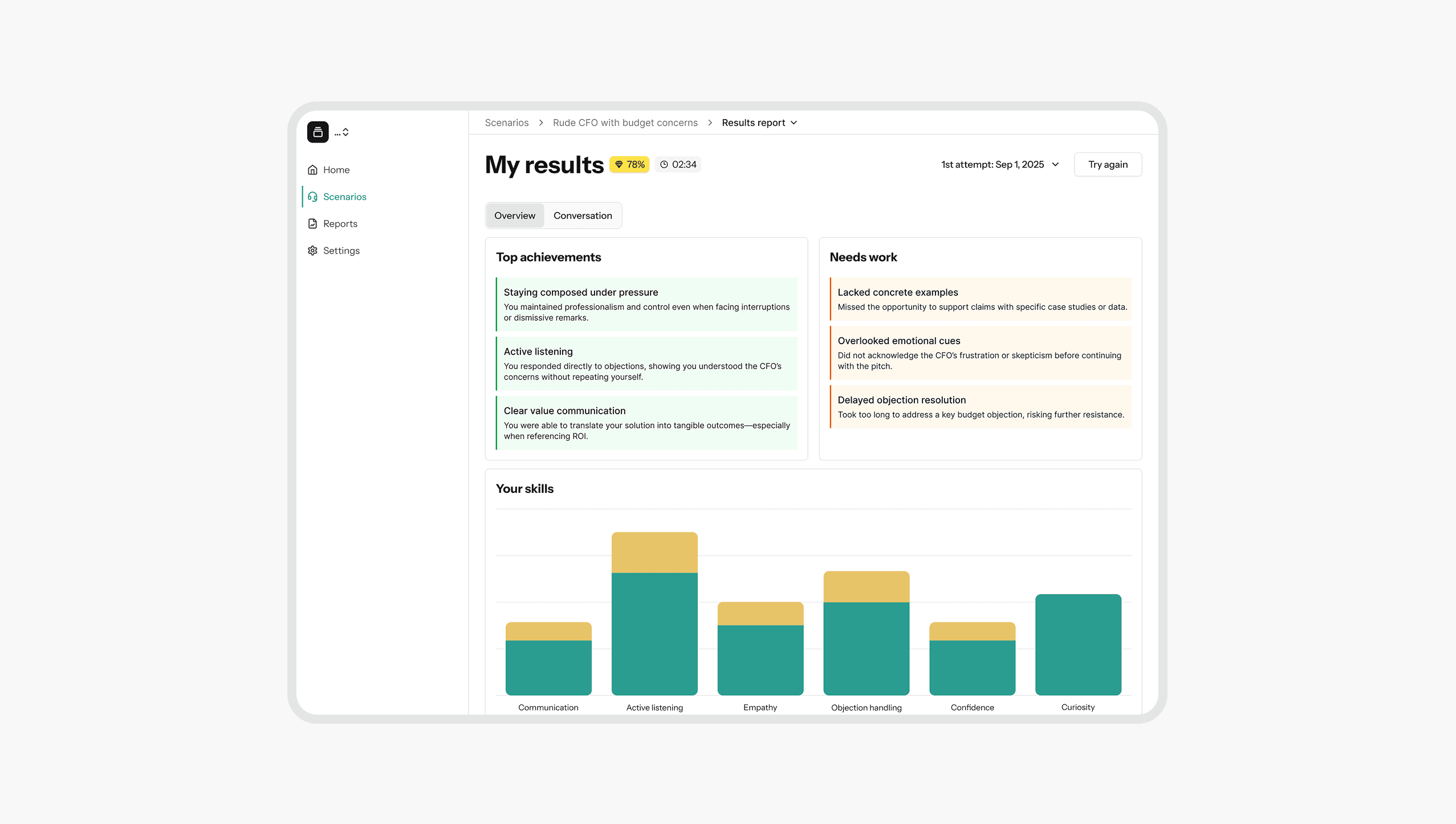 Most sales training breaks down at the worst moment: when a rep gets interrupted, challenged, or pushed into a hard objection. The goal with Arena was to make practice feel like a real call, then make the feedback specific enough that reps could improve on the very next attempt.