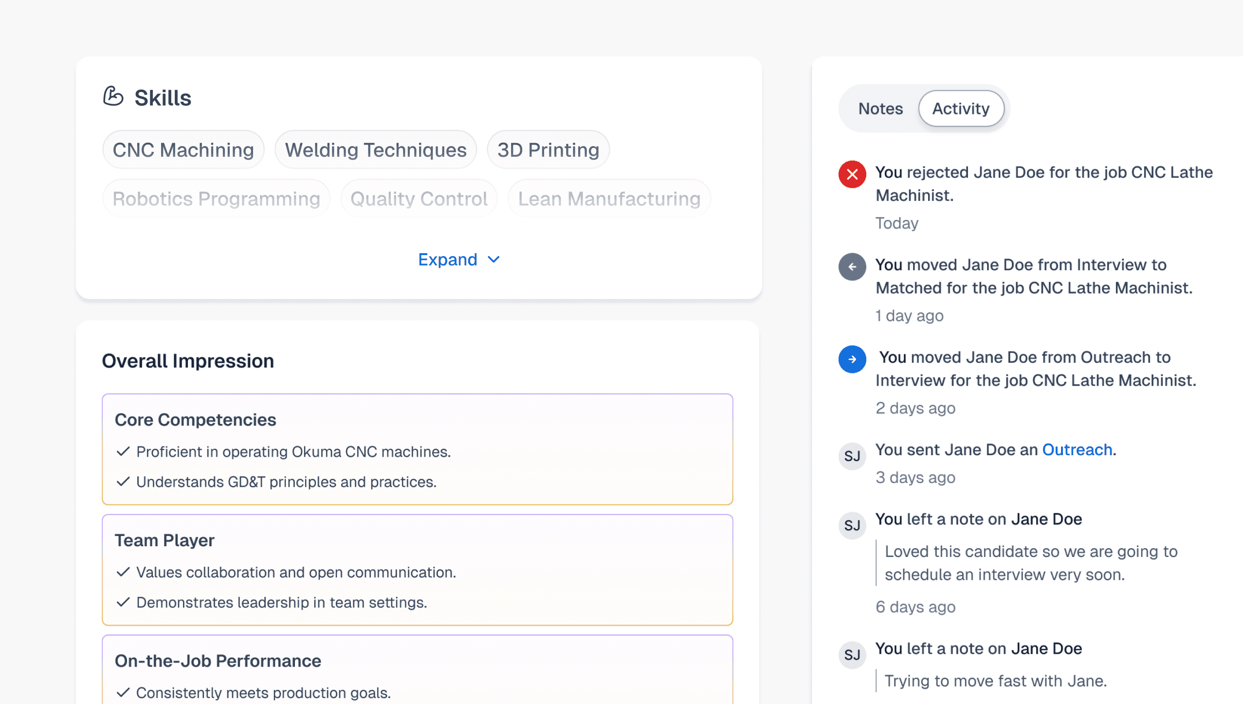 Scan candidates with confidence – by surfacing work history and skills in context.