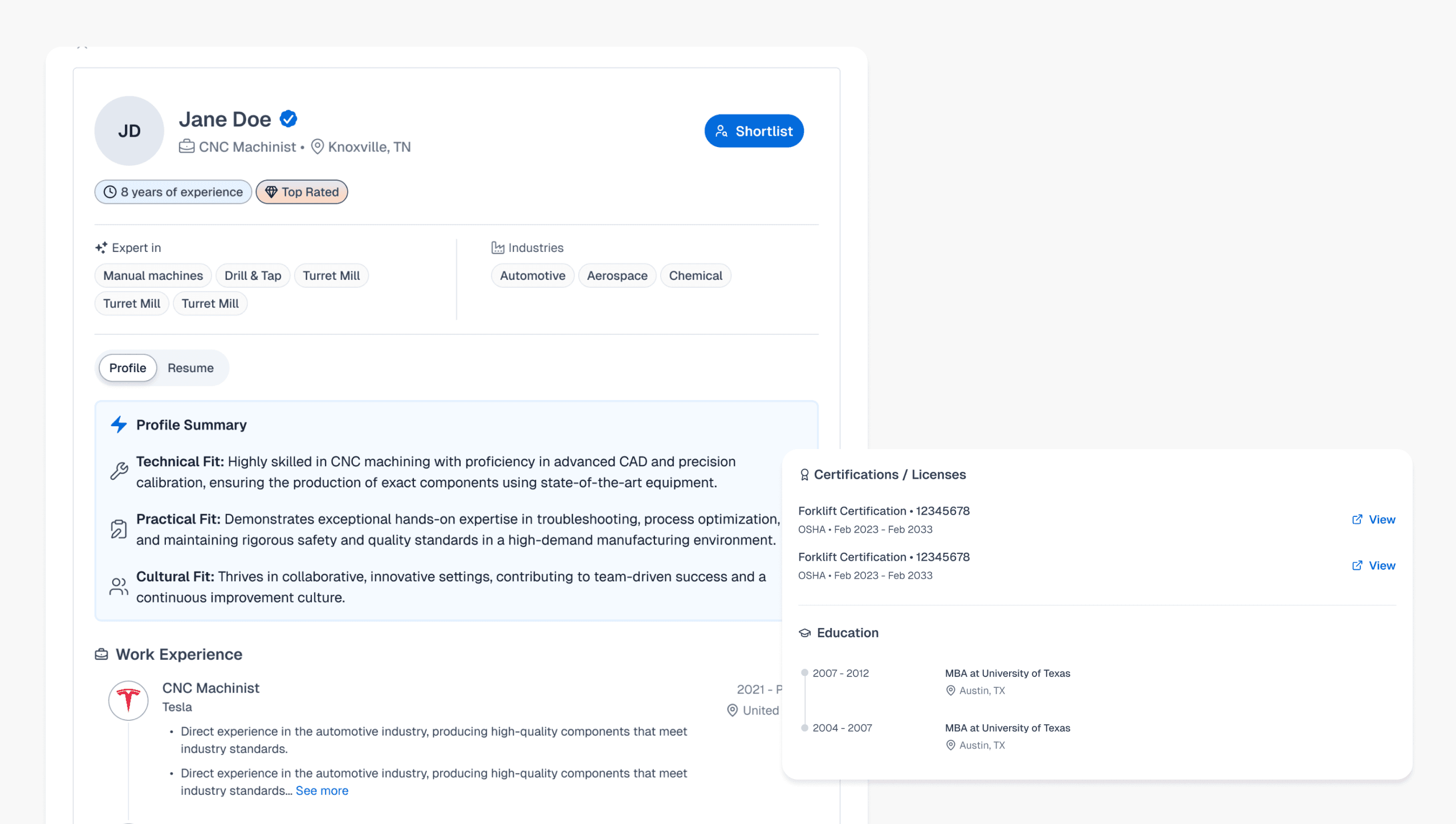 Filter with real-world relevance – skills, location, and certifications, all prioritized for industrial roles.